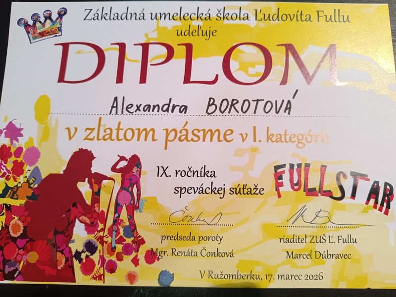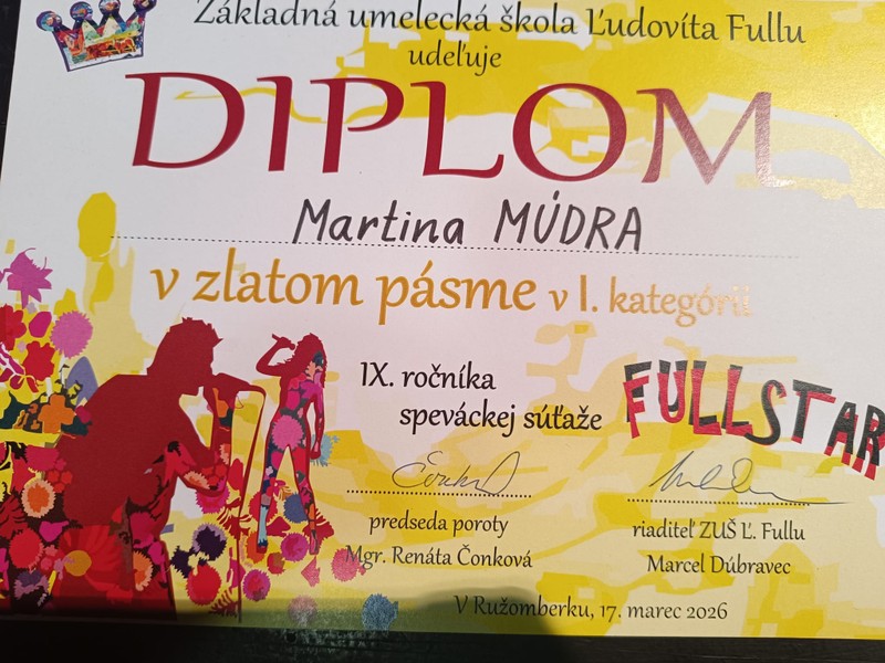 Gratulujeme našim úspešným reprezentantkám speváckeho oddelenia hudobného odboru v celoslovenskej súťaži FULLSTAR 2026! ( vyučujúce Mgr. Slávka Meravá a Mgr. Barbora Zbořilová ) !